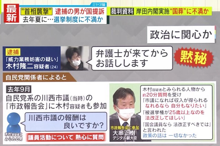 さらに、自民党関係者によると、2022年9月に行われた自民党系の川西市議(当時)の市政報告会に木村容疑者とみられる人物が参加し、「市議の報酬は良いですか?」など、熱心に質問していたといいます。また、その場にいた大串デジタル副大臣にも、「被選挙権の法改正をしてほしい」などと約20分も話したということです。