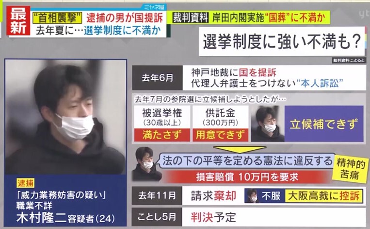 木村容疑者は2022年7月の参院選に立候補しようとしましたが、被選挙権(30歳以上)を満たさず供託金(300万円)も用意できなかったことから断念。そのことを「法の下の平等を定める憲法に違反していて、精神的苦痛を受けた」として、国相手に損害賠償10万円を要求する裁判を起こしていたことが判明しました。