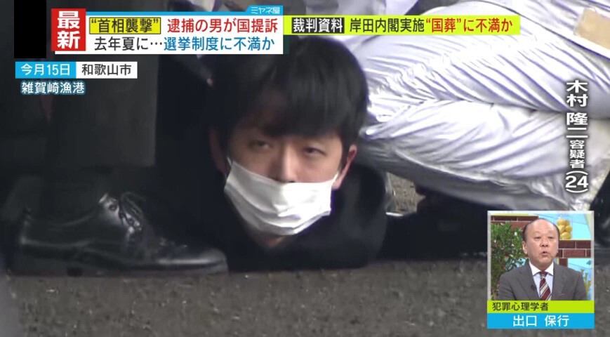 岸田首相の演説会場に爆発物が投げ込まれた事件で、逮捕された木村隆二容疑者は、選挙制度を巡り国を相手に提訴していたことが明らかになりました。また、昨年、岸田内閣が行った安倍元首相の国葬にも強い不満を持っていたこともわかりました。事件から3日経ち、徐々に足取りが見えてくるも、木村容疑者は依然として黙秘を続けています。犯行動機は何なのでしょうか?犯罪心理学者、出口保行氏の解説です。