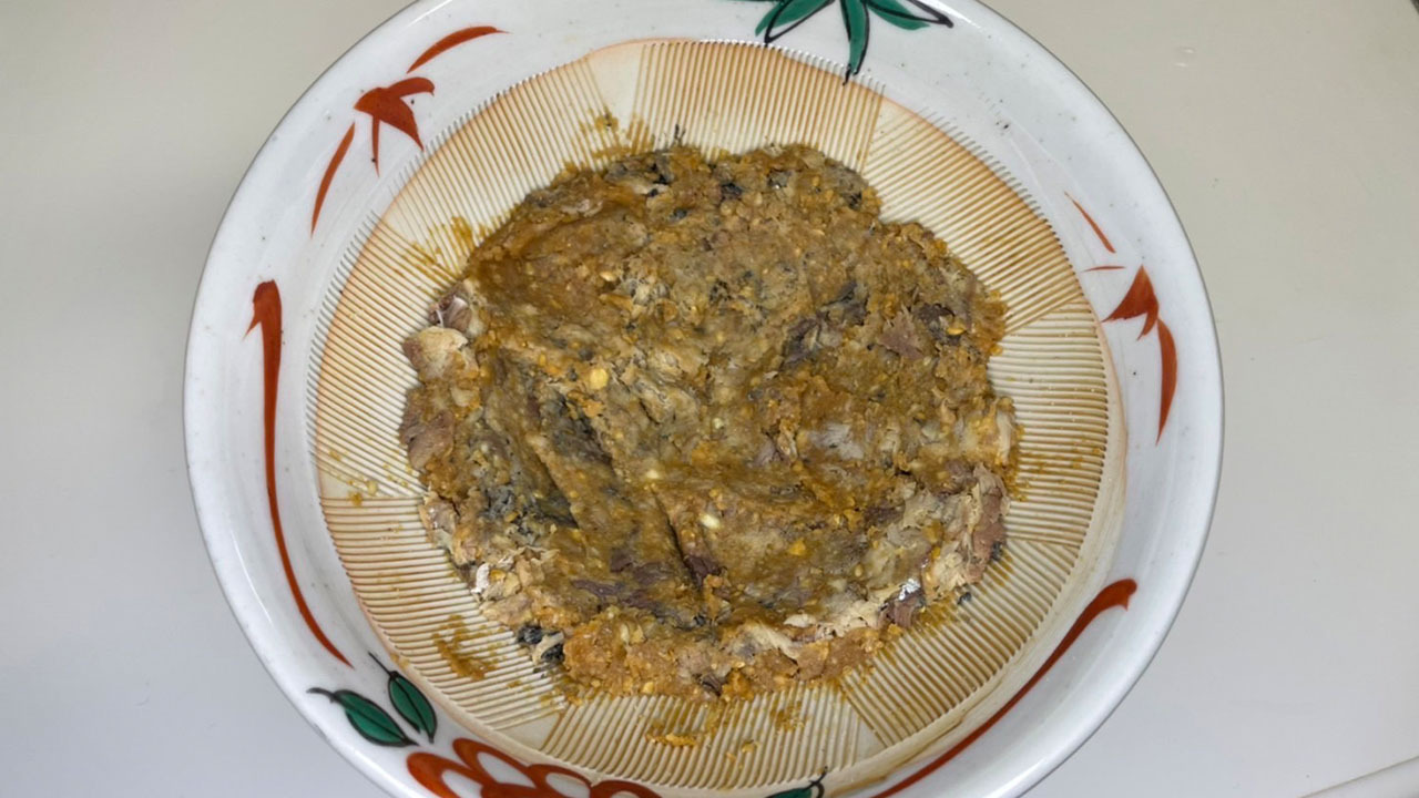 ③ ②にサバ缶半分と味噌を合わせて、すり鉢に貼り付ける