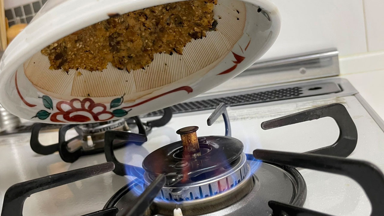 ④ すり鉢を伏せて、ガスで焼き、焦げ目をつける(火傷に注意!)