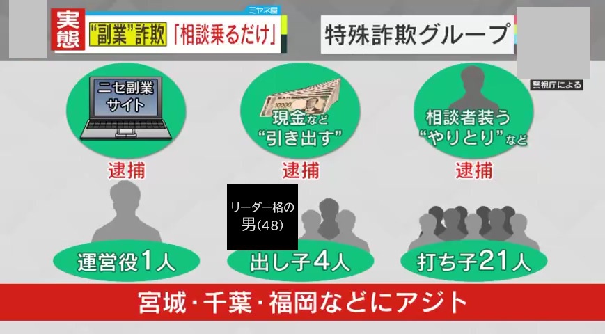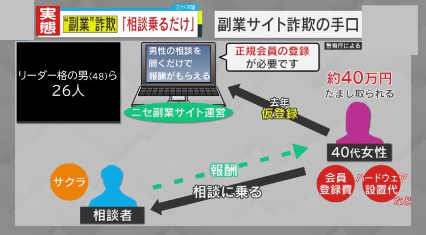 詐欺などの疑いで警視庁に逮捕されたのは、特殊詐欺グループのリーダー格の男(48)。2024年6月、“ニセ副業サイト”を使って女性(40代)から金を騙し取った疑いなどで、このグループの男女26人が逮捕されました。警視庁によると、このグループが運営していたのも「チャットで男性の相談を聞くだけで報酬がもらえる」などと謳うサイトです。
