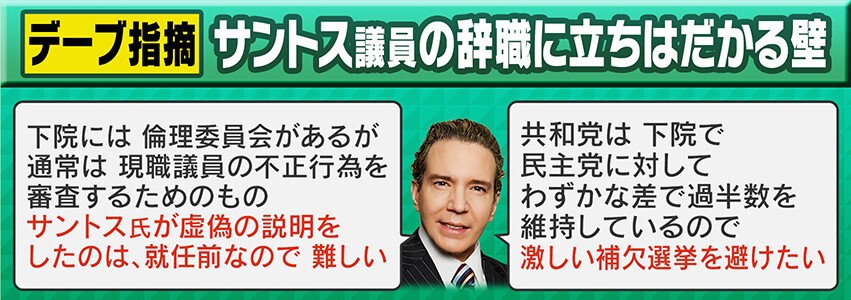 日本には公職選挙法がありますが、デーブさんによるとアメリカの場合、「下院には倫理委員会があるが、通常は現職議員の不正行為を審査するためのもの。サントス氏が虚偽の説明をしたのは議員就任前なので難しい」としています。