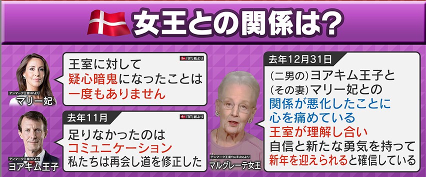 一方、女王との関係について、マリー妃は、「王室に対して疑心暗鬼になったことは一度もありません」としています。ヨアキム王子は「足りなかったのはコミュニケーション。私たちは再会し、道を修正した」と話しています。マルグレーテ女王も「ヨアキム王子とマリー妃との関係が悪化したことに心を痛めている。王室が理解し合い自信と新たな勇気を持って新年を迎えられると確信している」とコメントしています。