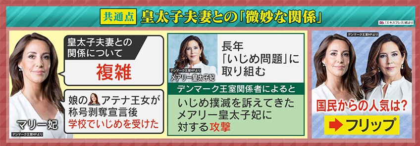 マリー妃は皇太子夫妻との関係について聞かれた際に「複雑」と答えています。さらに、「娘のアテナ王女が称号剥奪宣言後、学校でいじめを受けた」と話しています。この“いじめ発言”ですが、メアリー皇太子妃が長年「いじめ問題」に取り組んでいることから、デンマーク王室関係者はいじめ撲滅を訴えてきたメアリー皇太子妃に対する攻撃ではないかとみています。