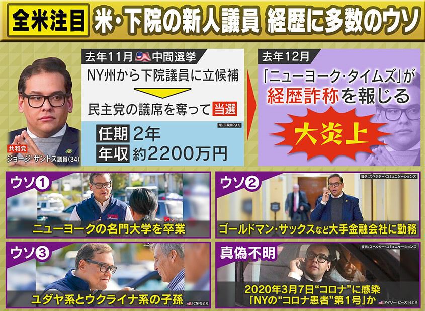 まずはアメリカからです。共和党のジョージ・サントス議員は、2022年11月の中間選挙でニューヨーク州から下院議員の立候補し、民主党の議席を奪って当選しました。任期は2年です。しかし2022年12月に「ニューヨーク・タイムズ」がサントス氏の経歴詐称を報じ、大炎上しました。
