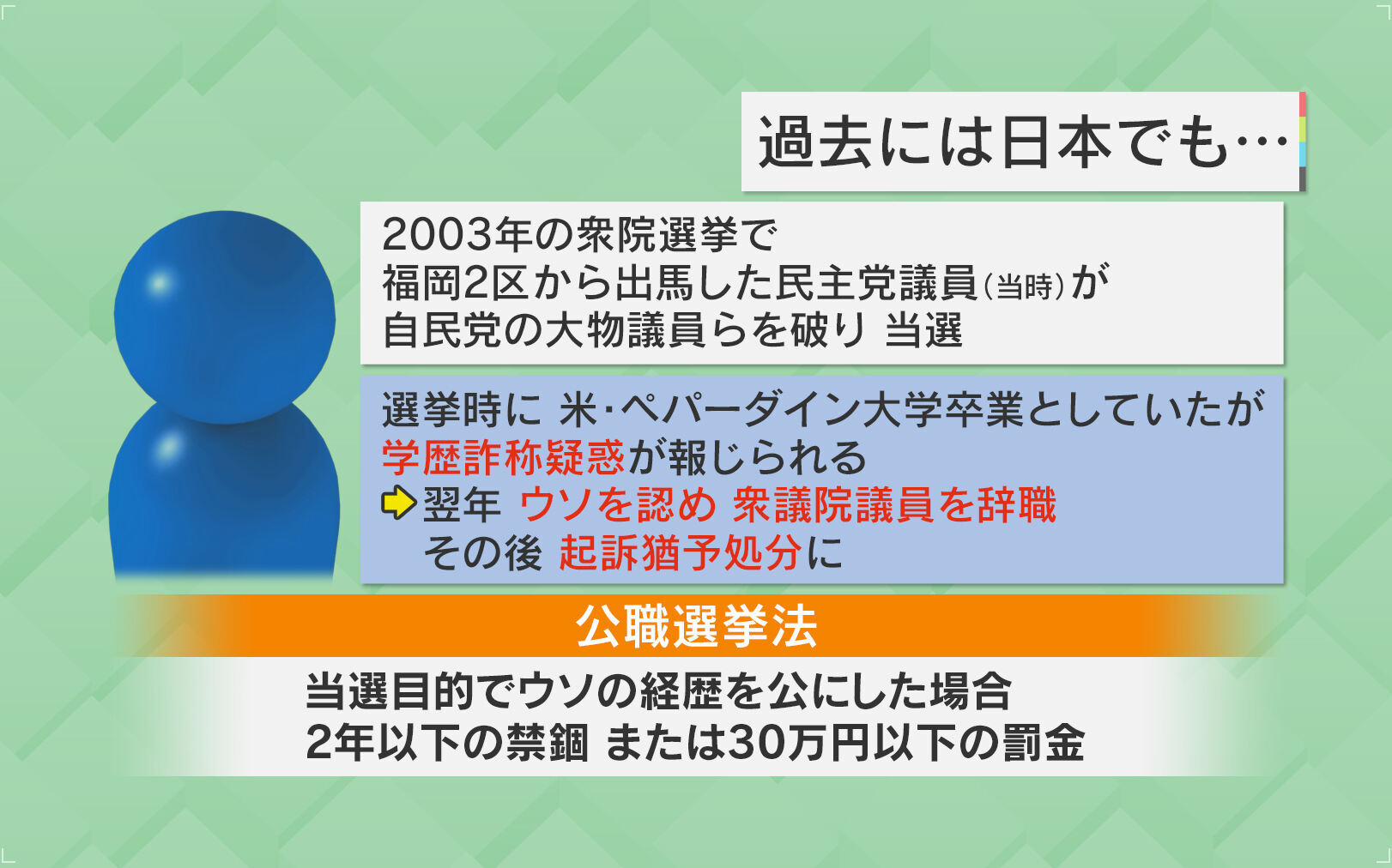 経歴詐称は過去に日本でもありました。2003年の衆院選で、福岡2区から出馬した民主党議員が、自民党の大物議員らを破って当選しました。その議員は選挙時にアメリカのペパーダイン大学卒業としていましたが、学歴詐称疑惑が報じられ、2004年、議員はウソの学歴を認め衆議院を辞職、その後、起訴猶予になっています。日本では公職選挙法で、「当選目的でウソの経歴などを公にした場合、2年以下の禁固または30万円以下の罰金」と定められています。