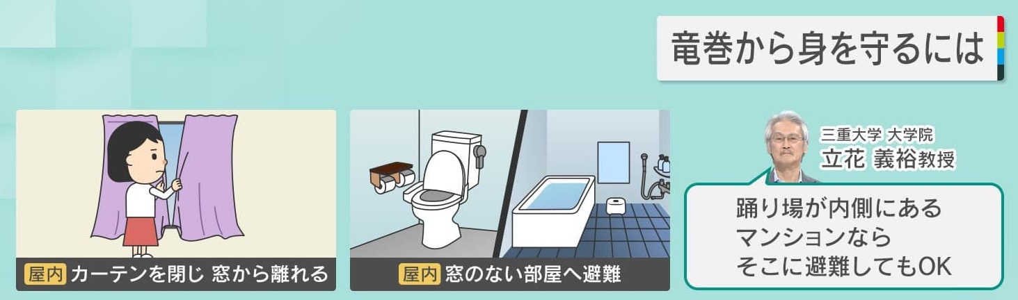 竜巻から身を守るためには、屋内に居た場合、カーテンを閉じ、窓から離れ、窓の少ない部屋(トイレや浴室)へ避難します。踊り場が内側にあるマンションの場合、そこに避難しても良いということです。