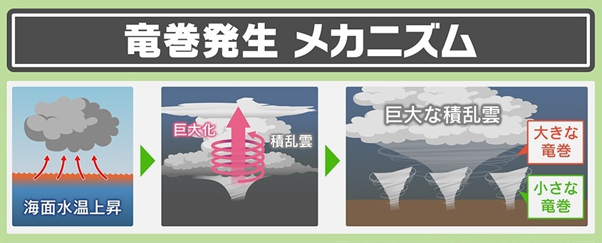 竜巻発生のメカニズムは、まず海面水温が上昇し、水蒸気が生まれ、雲が出来ます。その雲が積乱雲に発達し、巨大化すると、上昇気流が渦を巻きます。巨大な積乱雲から大きな竜巻が生まれ、そこから小さな竜巻が生まれるということです。