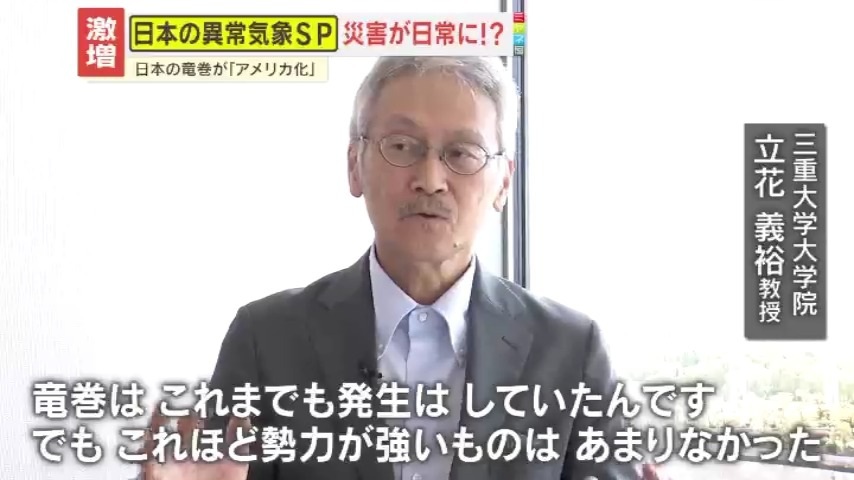 9月に頻発している竜巻などの突風被害について、三重大学大学院・立花義裕教授によると、「竜巻は、これまでも発生はしていたんです。でも、これほど勢力が強いものは、あまりなかったんです。近年どんどん勢力が強くなってきており、竜巻のアメリカ化が進んでいる」ということです。