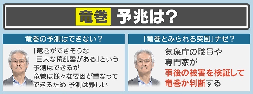 竜巻の予兆や予測について、立花教授によると「『竜巻が出来そうな巨大な積乱雲がある』という予測はできるが、竜巻は様々な要因が重なってできるため、予測は難しい」ということです。
