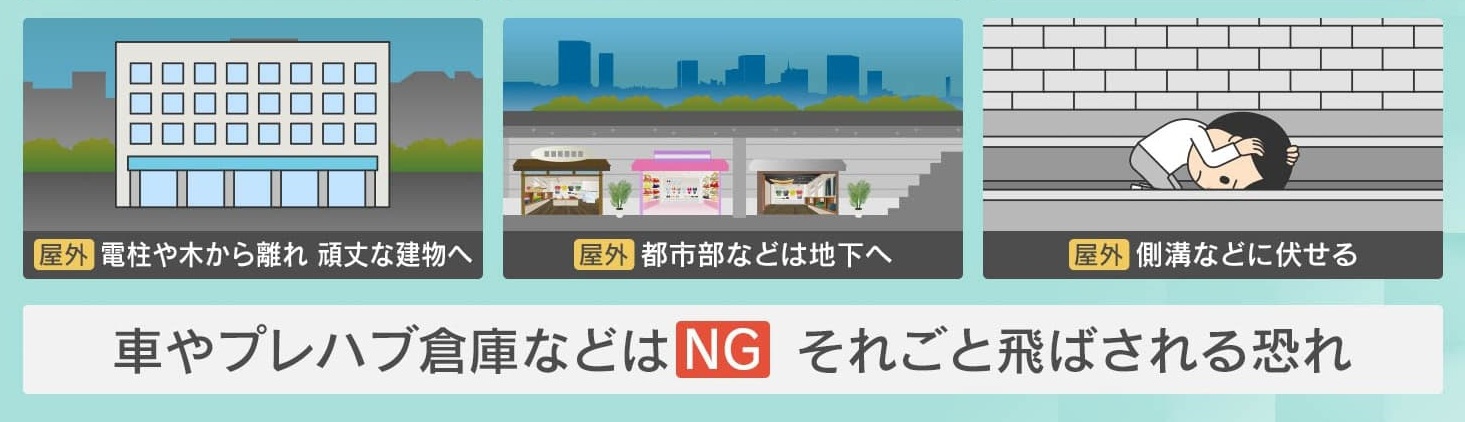 屋外に居た場合は、電柱や木から離れ、頑丈な建物(都市部などの場合は地下)へ避難してください。側溝などに伏せるのも良いということです。しかし、車・プレハブ倉庫などはそれごと飛ばされてしまう恐れがあるため良くないということです。