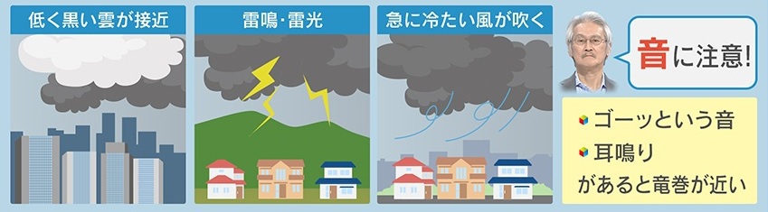 竜巻が発生するサインは、『低く黒い雲が接近してきている』『雷鳴・雷光がある』『急に冷たい風が吹く』、また、特に“音”に注意だということで、『ゴーッという音』や耳鳴りがあると竜巻が近いといいます。