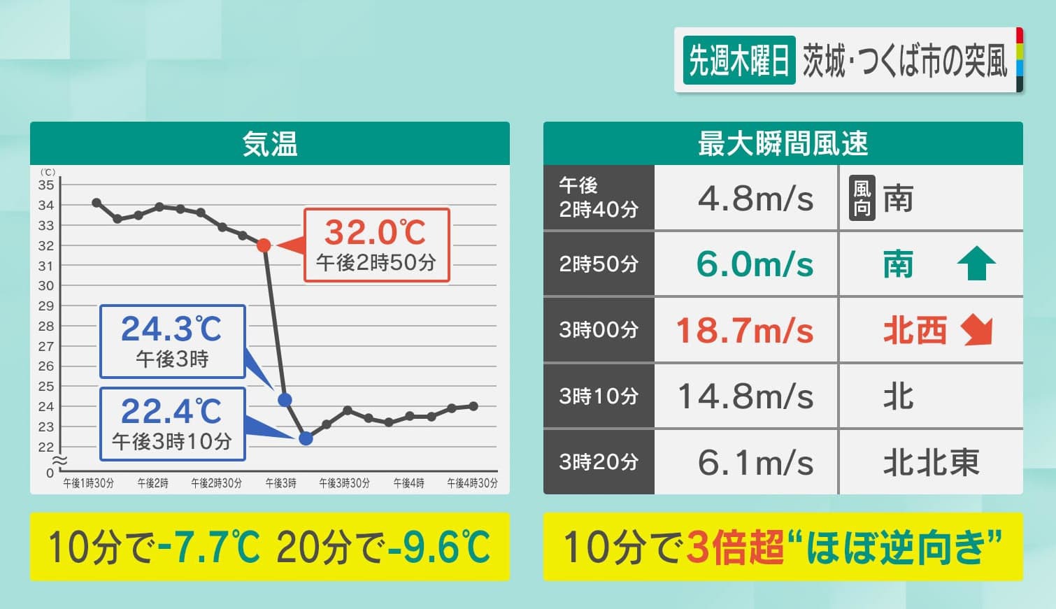 2025年9月18日のつくば市の突風が来た際の気温を見てみると、午後2時50分に32℃だったのが10分で7.7℃、20分で9.6℃下がったといいます。そして最大瞬間風速も、午後2時50分には6m/sで南から吹いていた風が、10分後には18.7m/sになり、北西からの風に変わったということです。