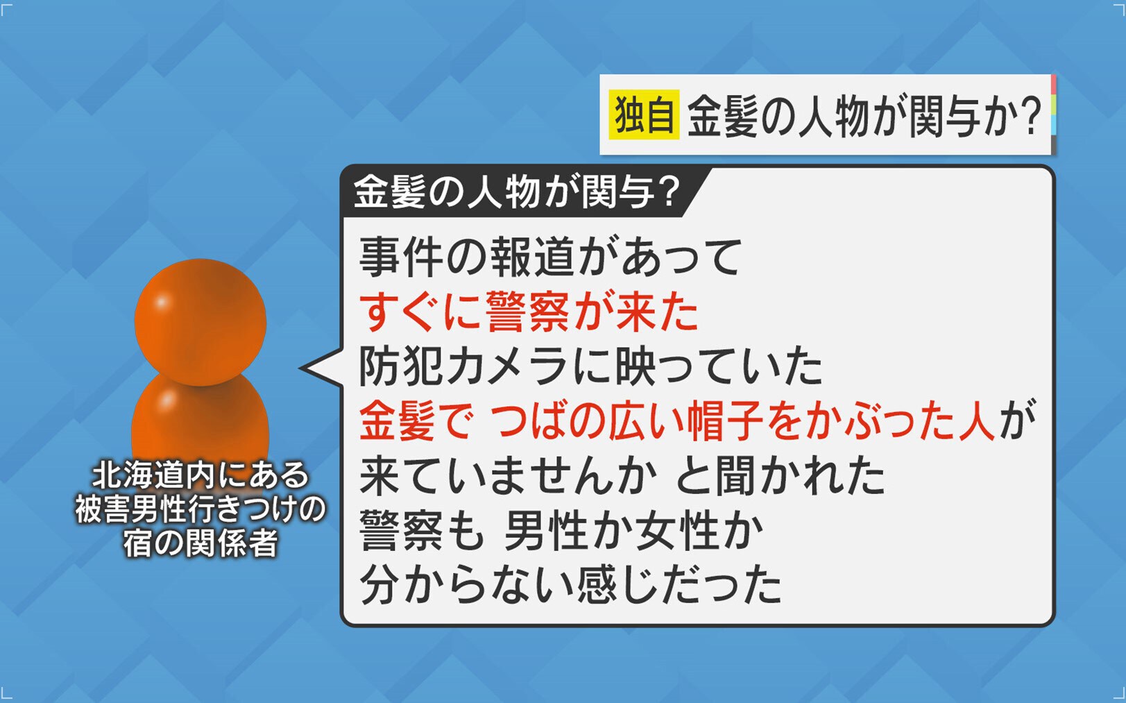 趣味のツーリングで、被害男性が年に4回は泊まるという宿泊施設の関係者に取材したところ「事件の報道があってすぐに警察が来た。『防犯カメラに映っていた金髪でつばの広い帽子をかぶった人が来ていませんか』と聞かれた。警察も男性か女性か分からない感じだった」という新しい証言を得ました。