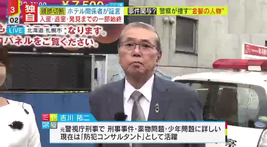 北海道・すすきのにあるホテルで頭部が切断された遺体が見つかった事件で、ホテルの関係者を独自取材しました。そこで明らかになった遺体発見時の生々しい一部始終とは?一方、警察が事件直後、「金髪で、つばの広い帽子を被った人物」の行方を捜査していたことがわかりました。元警視庁刑事の吉川祐二氏が解説します。