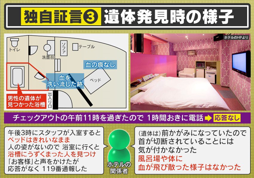 遺体が発見された部屋は、入ってすぐに寝室があるのですが、そこに血の跡はなかったということです。男性の遺体は、部屋の奥にある浴室で見つかりました。ホテル関係者によると「チェックアウトの午前11時を過ぎたので1時間おきに電話をしたが応答はなかった。そこで午後3時にスタッフが入室すると、ベッドはきれいなまま。人の姿がないので浴室に行くと浴槽にうずくまった人を見つけ、『お客様』とお声をかけたが応答がなく119番通報をした」「遺体は、前かがみになっていたので、首が切断されていることには気が付かなかった。風呂場や体に血が飛び散った様子はなかった」ということです。