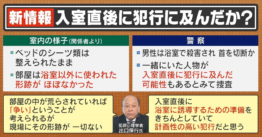 一方、事件のあったホテルの関係者は室内の様子について「ベッドのシーツ類は整えられたまま」「部屋は浴室以外に使われた形跡がほぼなかった」と話しています。警察によると「男性は浴室で殺害され、首を切断か」「一緒にいた人物が入室直後に犯行に及んだ可能性もあるとみて捜査」しているとのことです。犯罪心理学者の出口保行氏は、「部屋の中が荒らされていれば『争い』ということが考えられるが、現場にその形跡が一切ない」「入室直後に浴室に誘導するための準備をきちんとしていて、計画性の高い犯行だと思う」と分析しています。