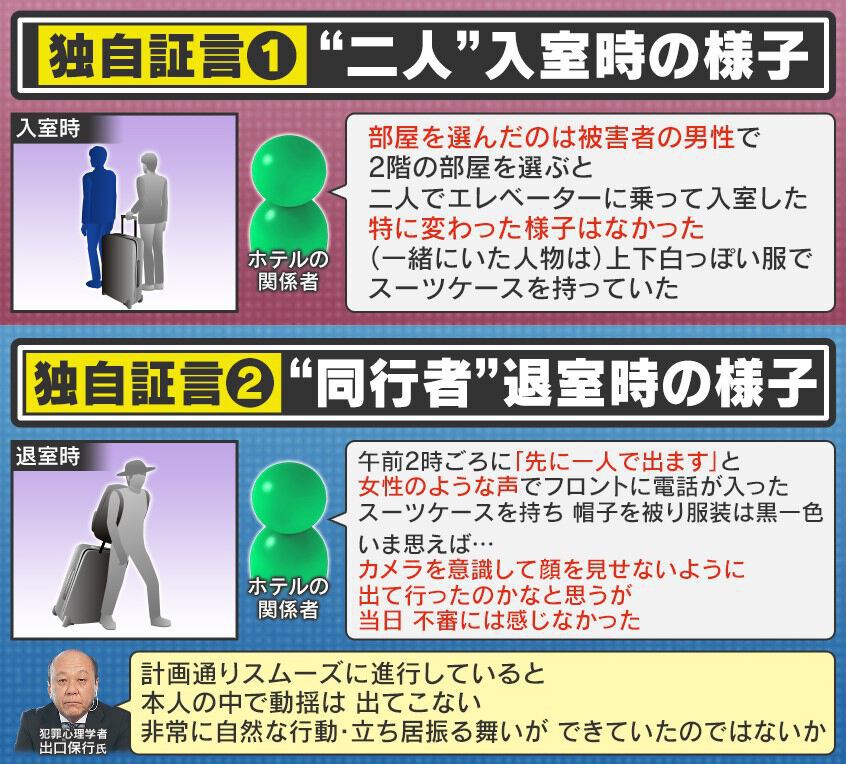 退出時の様子は「午前2時頃に『先に一人で出ます』と女性のような声でフロントに電話が入った。スーツケースを持ち帽子をかぶり服装は黒一色。いま思えば、カメラを意識して顔を見せないように出ていったのかなとは思うが、当日不審には感じなかった」ということです。