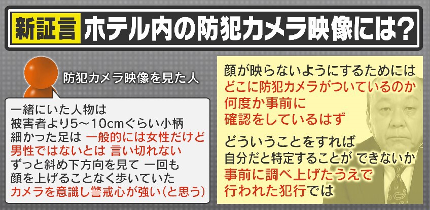 そして、新たな証言も。実際に防犯カメラ映像を見た人物は「一緒にいた人物は、被害者より5~10cmくらい小柄。細かった足は、一般的には女性だけど男性ではないとは言い切れない。ずっと斜め下方向を見て一回も顔を上げることなく歩いていた。カメラを意識し警戒心が強いと思う」と話しています。