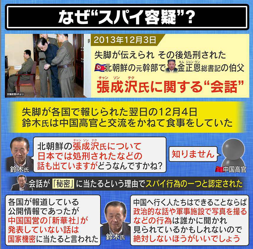 鈴木さんがスパイ容疑をかけられた理由は何だったのでしょうか?中国側は、2013年12月4日に、中国高官と北朝鮮に関する話題をしたことが国家秘密にあたる内容だったとしています。鈴木さんによると、12月4日、確かに中国高官と食事の際に、北朝鮮の話はしたということです。しかし、話した内容を巡っては、前日に北朝鮮の金正恩の伯父・張成沢氏が失脚したことが各国で報じられたことをうけて、「北朝鮮の張成沢氏について、日本では処刑されたなどと報道されていますが、どうなんですかね?」と聞いただけだと主張しています。鈴木さんは「各国が報道している公開情報であったが、中国国営の『新華社』が発表していない話は国家機密に当たる」と言われたそうです。