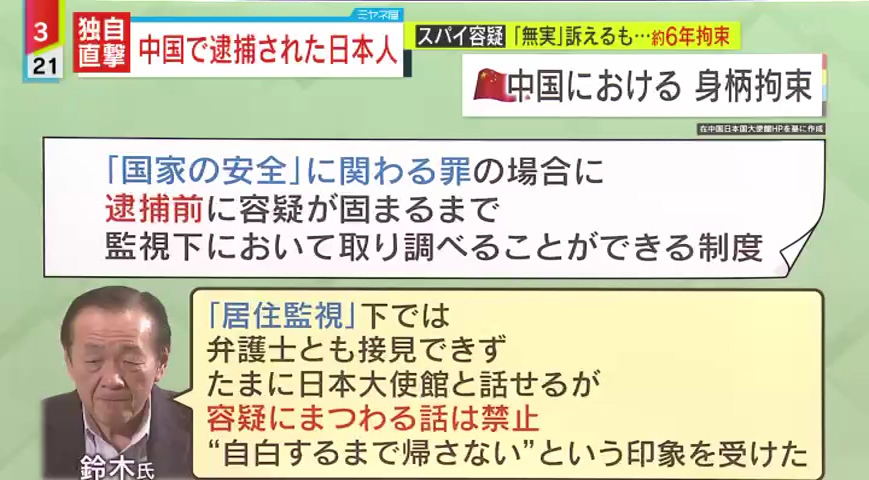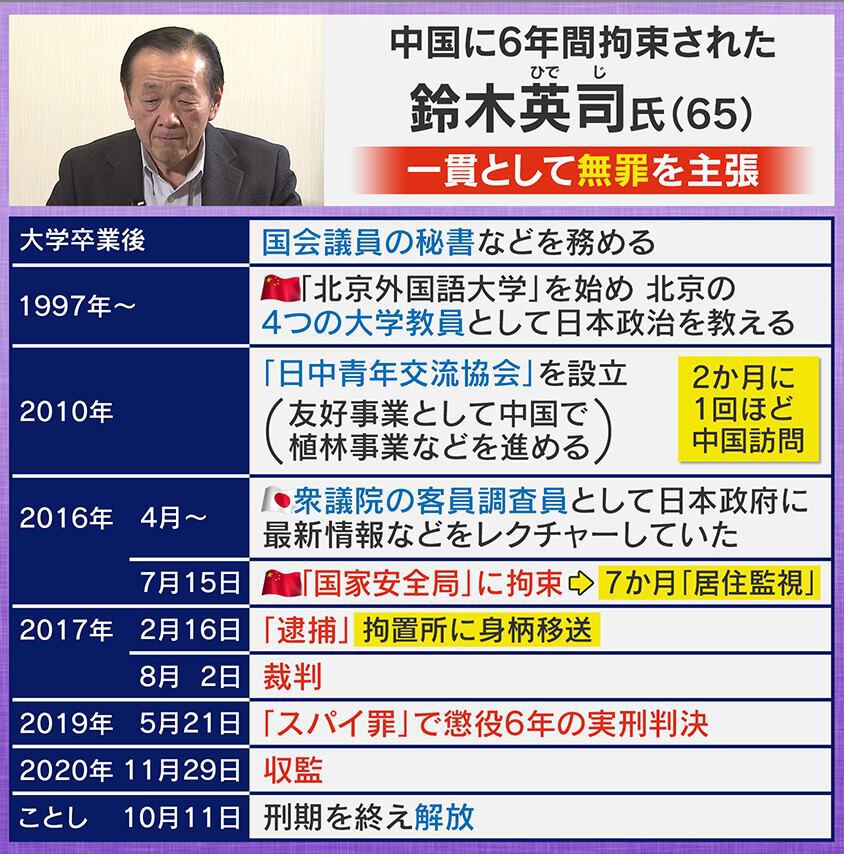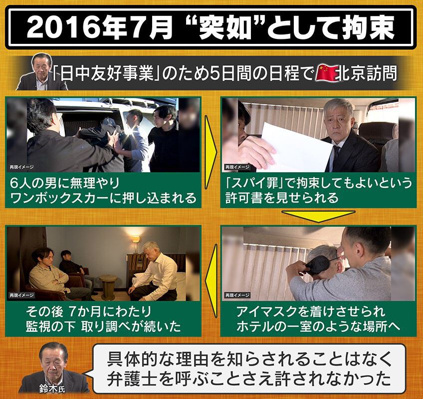 中国当局に、突然スパイ容疑で拘束された鈴木英司さん。鈴木さんは拘束後、7か月もの間24時間監視下におかれ、その後身に覚えのない「スパイ罪」で有罪判決となり、6年間人権を奪われた生活を送りました。その壮絶な実態を、元・中国特派員で、この問題を取材した読売テレビの高井プロデューサーが解説します。