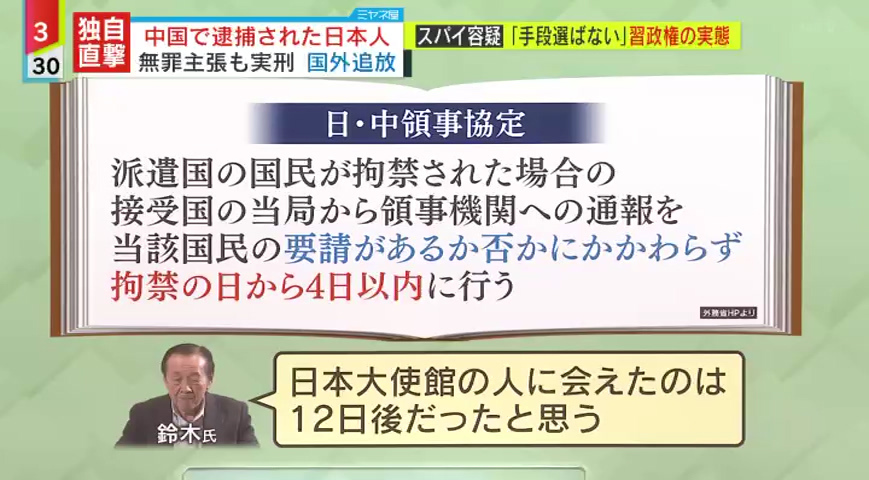 Q.『日・中領事協定』に「領事機関への通報は拘束の日から4日以内に行う」という決まりがあるのに、実際に面会できたのは12日後だという事ですが…