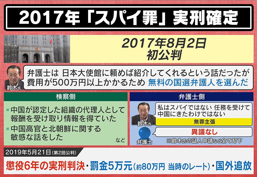 2017年8月2日、鈴木さんの初公判が開かれました。弁護士は日本大使館に頼めば紹介してくれるという話でしたが、費用が500万円以上かかるため 無料の国選弁護人を選びました。鈴木さんは無罪を主張しますが、検察の「中国が認定した組織の代理人として報酬を受け取り、情報を得ていた」「中国高官と北朝鮮に関する敏感な話をしていた」などの主張に、弁護士は「異議なし」と言ったそうです。1審は2回の公判で懲役6年が決まり、その後控訴しますが、判決は覆りませんでした。
