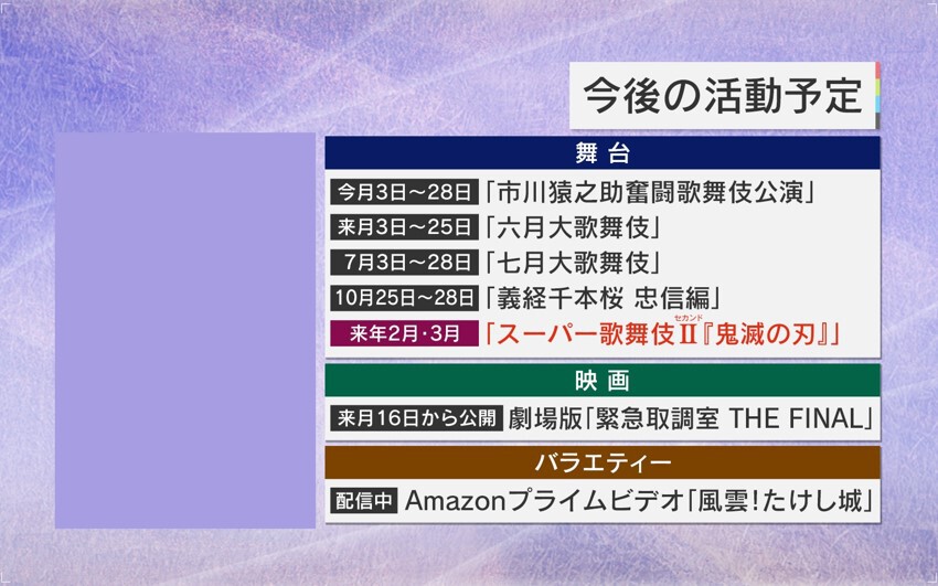 「6月の公演は古典の演目なので代役もありえます。7月の昼の部の演目は猿翁さんの家の芸を猿之助さんが受け継ぐという形なので、猿之助さんが出られないとなると意味がない部分があります。猿之助さんが出られないのなら、演目差し替えもあり得ます。来年2月の「鬼滅の刃」も主演だけでなくプロデュースもしていますので、演目差し替えも視野に入れて検討していると思います」