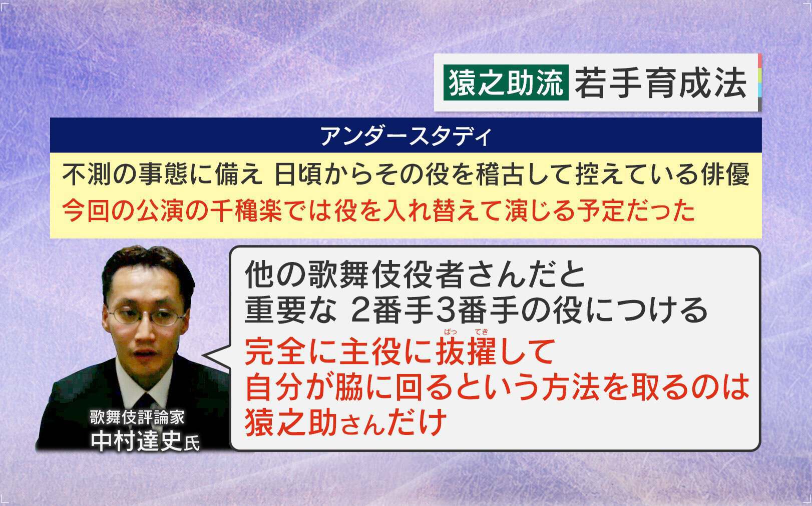 市川猿之助さんは、屋号の垣根を越えて積極的にキャスティングし、若手を育てていく方針だということです。もともと今回の公演の最終日には、猿之助さんと中村隼人さんの役を入れ替えて演じる予定だったそうです。歌舞伎評論家の中村氏によりますと「他の歌舞伎役者さんだと若手役者を主役の次に重要な2番手や3番手の役につける。完全に主役に抜擢して自分が脇に回るという方法を取るのは、猿之助さんだけ」ということです。