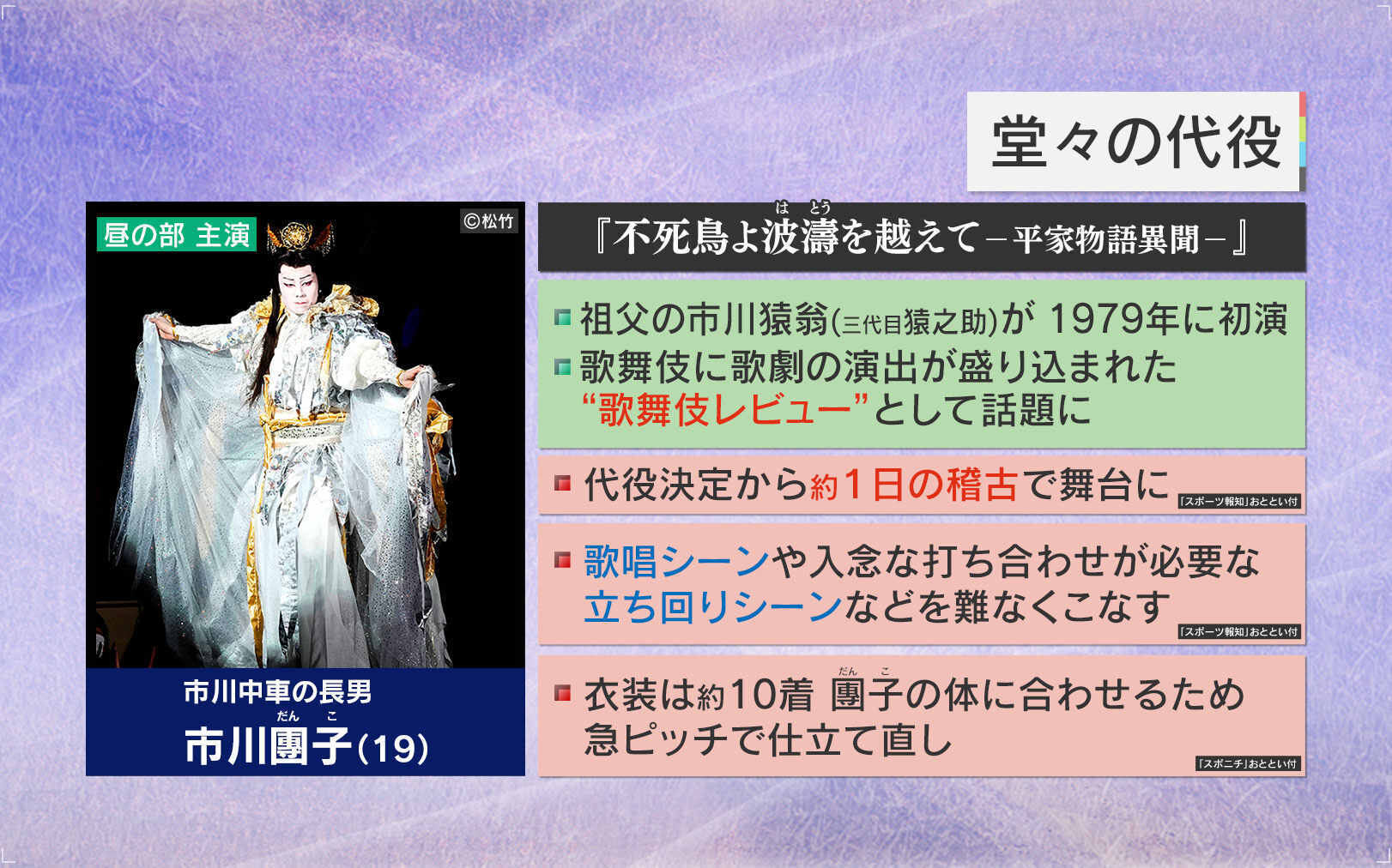 当初、市川猿之助さん(47)が主演を務めるはずだった舞台は、同じ澤瀉屋一門で市川中車さんの長男・市川團子さん(19)と萬屋の中村隼人さん(29)が代役を務める形となりました。代役の二人は連日圧巻の演技を見せているということです。2人の凄さと、今歌舞伎界が置かれている状況などを歌舞伎評論家・中村達史氏が解説します。