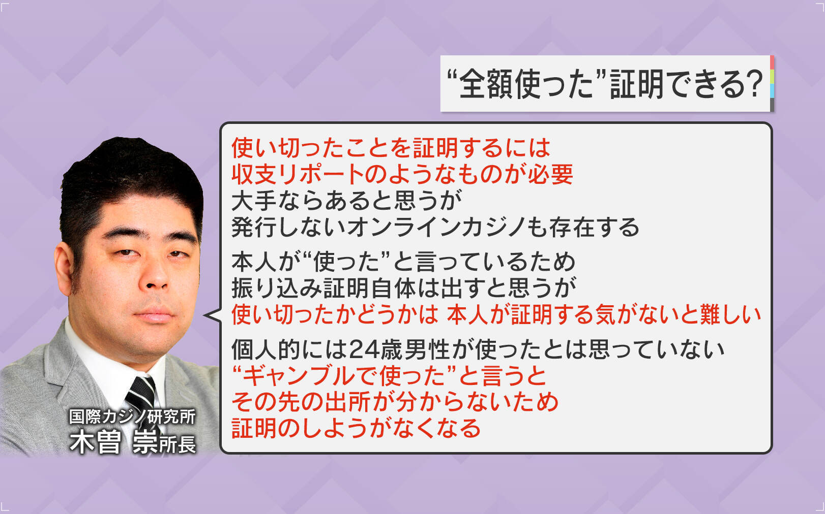 「使い切ったことを証明するには、収支リポートのようなものが必要です。大手のカジノならあると思いますが、発行しないオンラインカジノもあります。本人が“使った”と言っているので、振り込み証明自体は出すと思いますが、使い切ったかどうかは、本人が証明する気がないと難しいと思います。“ギャンブルで使った”と言うと、その先の出所が分からないため、証明のしようがなくなります」