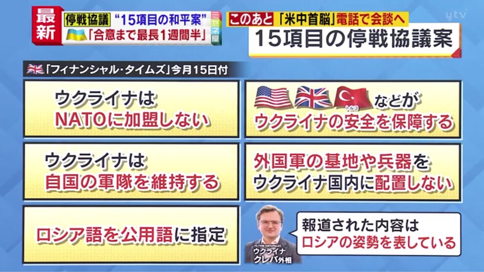 「言語のところは報道も不明確でして、恐らくロシア語の地位をしっかり確立してくれてということなんだと思います。そもそもウクライナ人の多くはロシア語も話します。例えばゼレンスキー大統領はロシア語の方が得意だともいわれているんです。ロシア語をしゃべる人が親ロシア派なわけではないですが、その中でロシア語が差別されないようにしっかりとその地位を固めてくれということです。これは文言次第ですが、恐らく折り合えるところだと思います。」