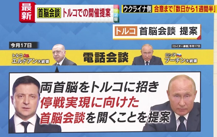 「どちらかに、あるいは両方に停戦の意思が本当にあるんだとしたら、こういう仲介役というのは意味を持つと思います。実際にプーチン大統領の電話会談等は報道によると、条件に関して踏み込んで議論をしているということです。先日、トルコで行われた外相会合以降、継続的にトルコは大統領レベル含めて関与しているようです。それが交渉の前進につながっているのかもしれません。」