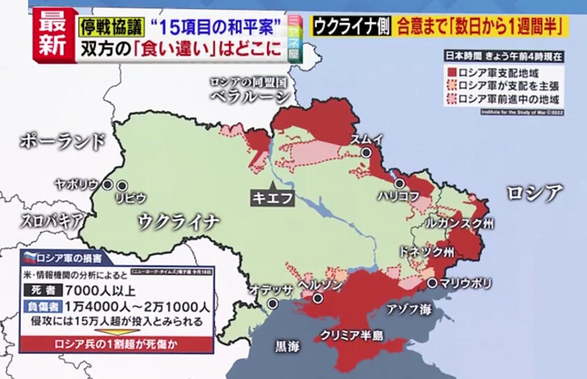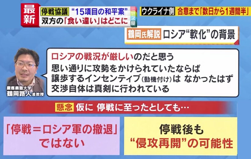 ロシアがウクライナに侵攻開始してから3週間、“停戦協議”に進展がみられています。ウクライナの代表団は「合意に達するには数日から1週間半ほどかかる」との見方を示しました。明らかになってきた“15項目の協議案”について、国際安全保障に詳しい慶応義塾大学、鶴岡路人(つるおか・みちと)准教授が解説します。