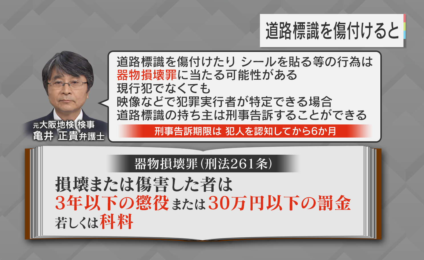 「道路標識を傷付けたり、シールを貼る等の行為は、『器物損壊罪』に当たる可能性がある。現行犯でなくても、映像などで犯罪実行者が特定できる場合、道路標識の持ち主は、刑事告訴することができる」