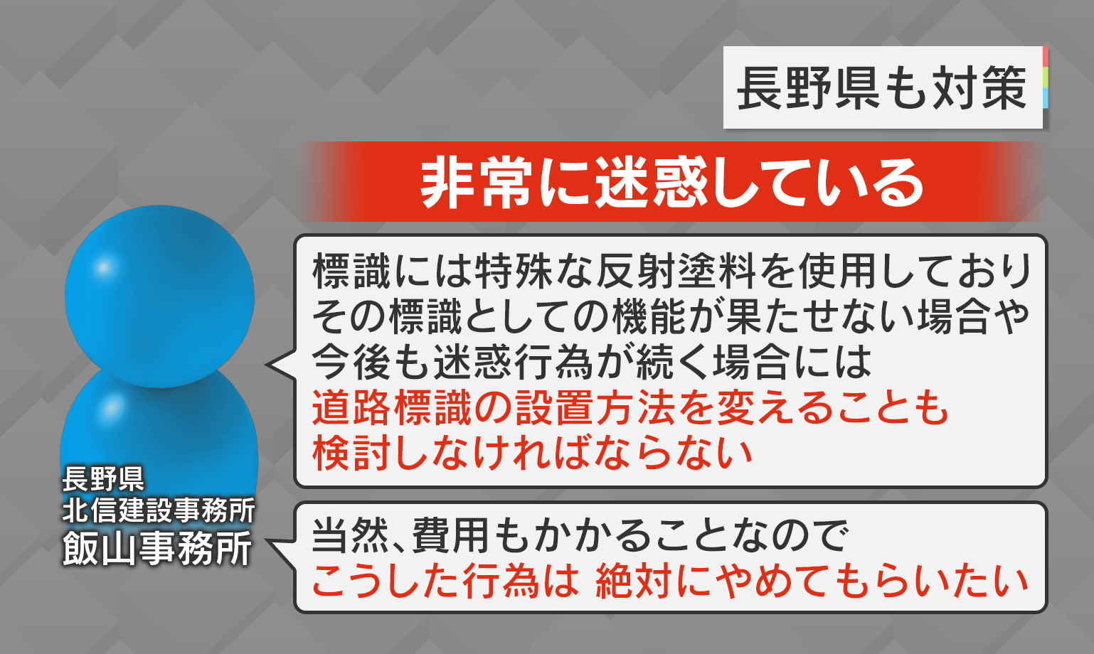 長野県の北信建設事務所の飯山事務所によると、「非常に迷惑をしている」として、「標識には特殊な反射塗料を使用しており、その標識としての機能が果たせない場合や今後も迷惑行為が続く場合には、道路標識の設置方法を変えることも検討しなければならない。当然、費用もかかることなので、こうした行為は絶対にやめてもらいたい」と話しています。