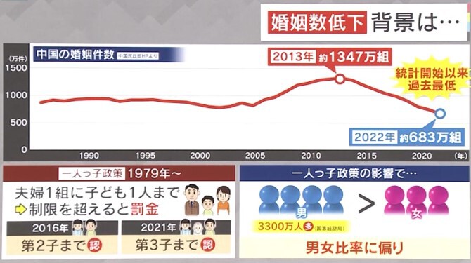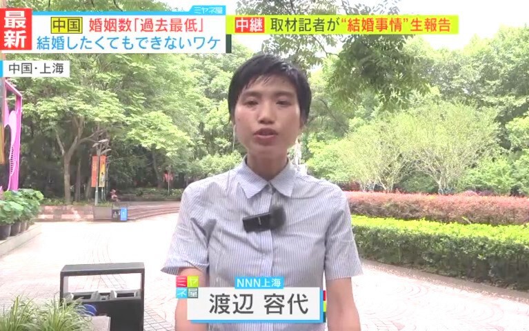 2023年現在、中国では結婚する人が激減し、2022年の婚姻数は683万3000組と、統計を始めて以降、過去最低を更新しました。婚姻数の低下の原因について、お見合い仲介業者は、「1.出会う時間がない、2.経済的な問題、3.みんな一人っ子で親の要求が高すぎる」と話していて、結婚相手を見つけるのは“至難の業”となっているようです。中国・上海在住のNNN上海支局長、渡辺容代特派員のリポートです。