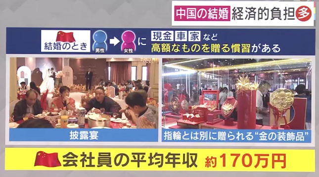 なぜ、婚姻数が低下しているのでしょうか。原因の一つが、結婚にかかる経済的な負担です。中国では、結婚に際し男性が女性に高額なもの(現金・車・家など)を送る慣習があり、高額な結婚費用を借金で工面することもあるといいます。会社員の平均年収は170万円なので、結婚費用を準備するのは厳しいということです。