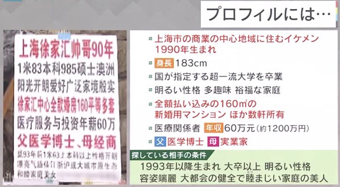 「何とも言えませんが、もし本当だとすると、すごく好条件ですよね。習近平国家主席も卒業した名門・清華大学など、中国でもトップクラスの大学を卒業していたり、博士号を取っていたり、アメリカ留学の経験があるなど、そういったことを記載している人が多いです。また、勤め先も国営企業や外資系金融機関に勤めていると書いている人が多かったです」