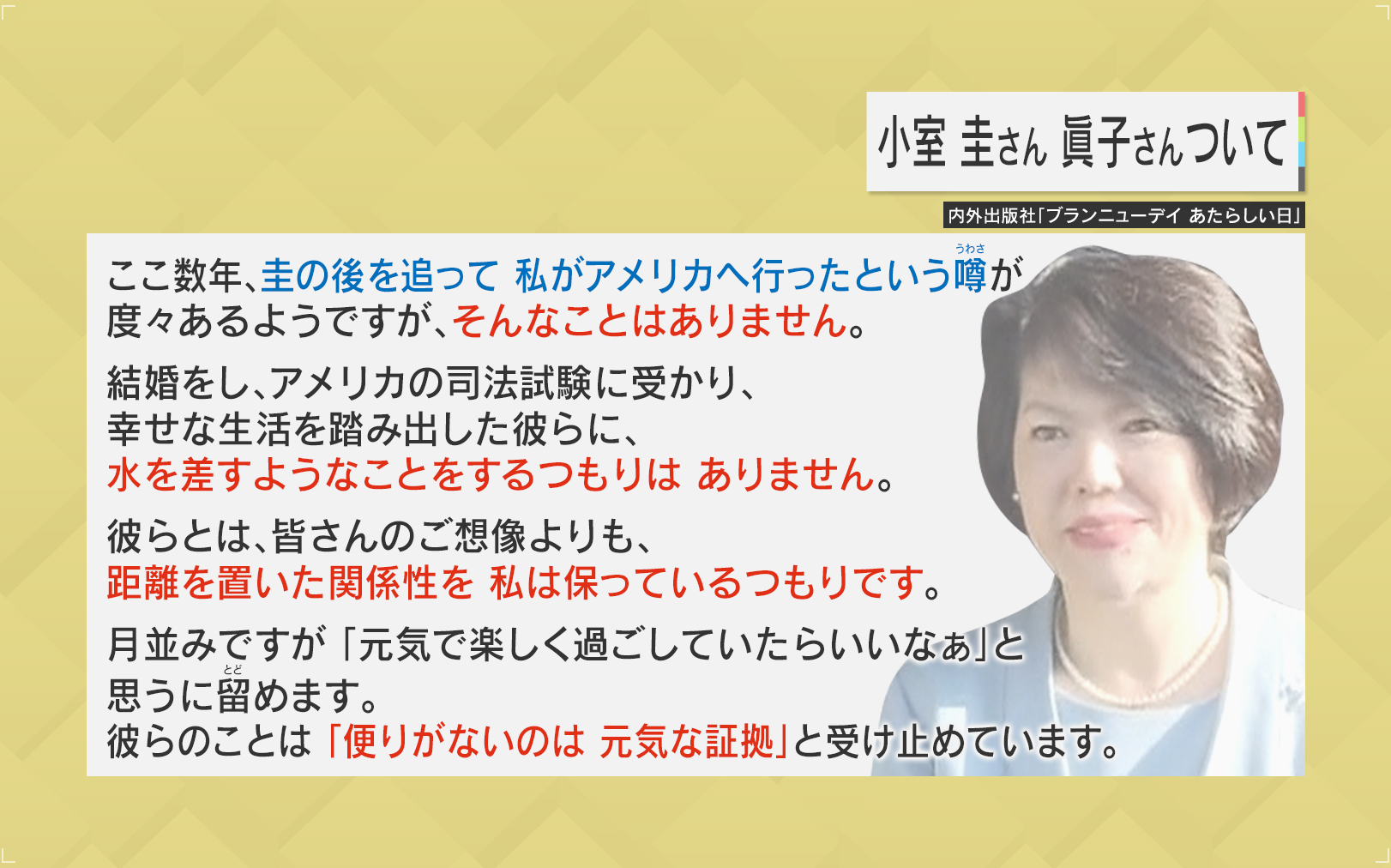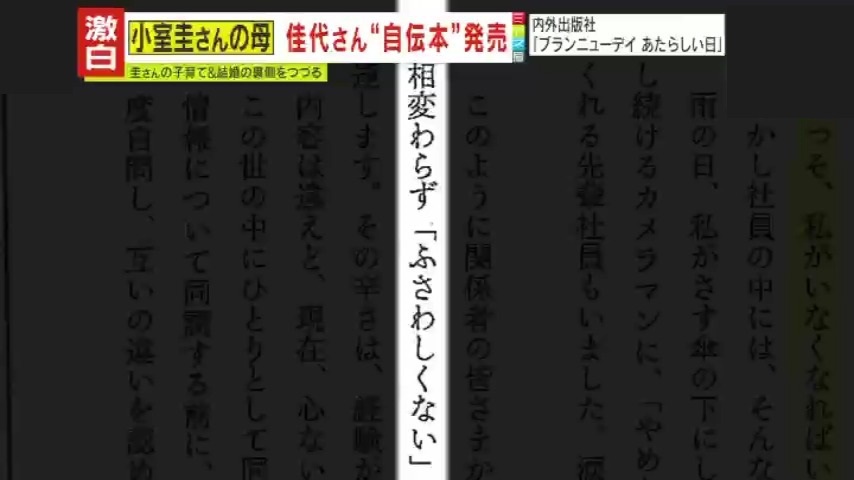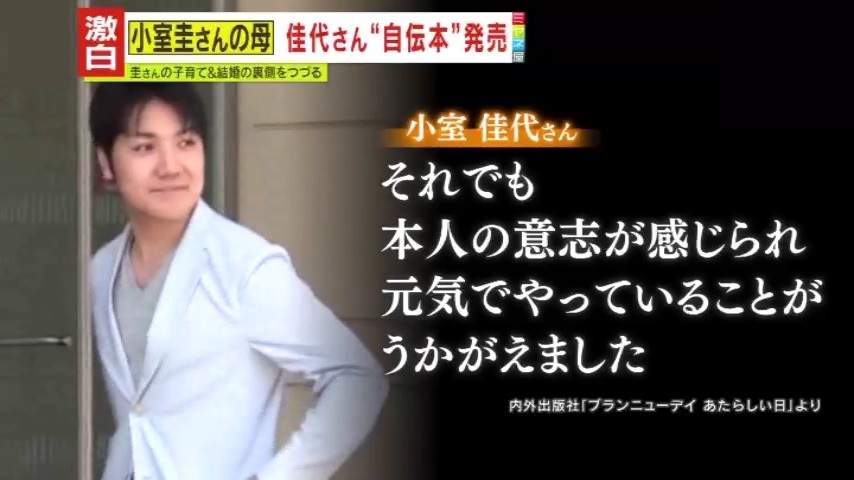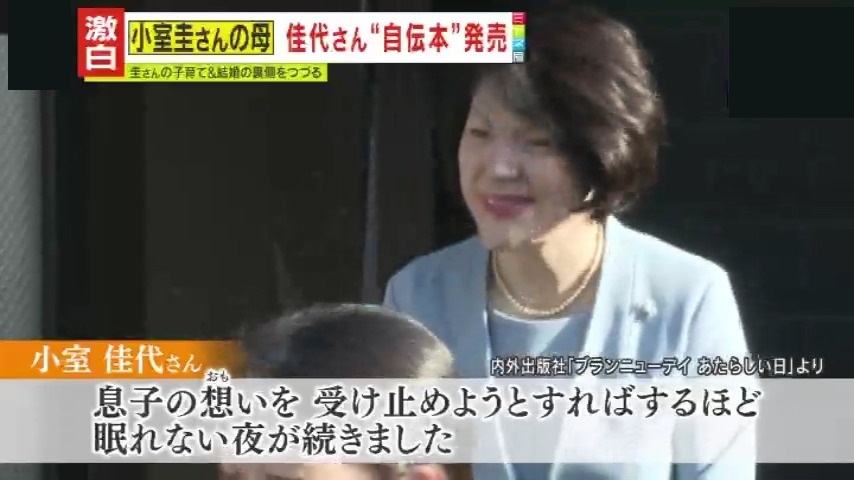 2025年2月6日、小室圭さんの母・佳代さんの自伝エッセイ『ブランニューデイ あたらしい日』が発売されます。『ミヤネ屋』では、その自伝本をいち早く入手。初めて明かされた圭さんとの親子関係、眞子さんとの結婚や騒動の裏側、そして息子夫婦への今の想いとは―。