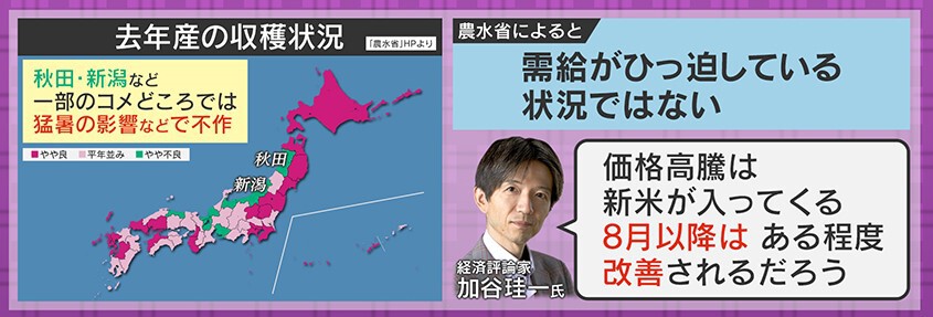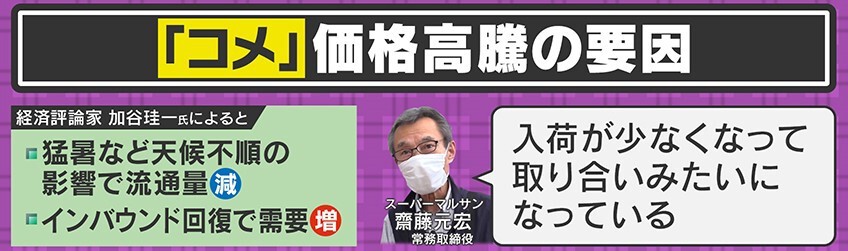 この「コメ」の価格高騰の原因を経済評論家の加谷珪一氏は「猛暑など天候不順の影響で流通量が減ったところに、インバウンドの回復で需要が増えたため」だとしています。スーパーマルサンの齋藤常務は「入荷が少なくなって取り合いみたいになっている」と話しています。