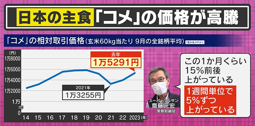 コメの価格は2年前から上がり続けていて、スーパーマルサンの齋藤元宏常務取締役によると「この1か月くらいで15%くらい上がっている。1週間単位で5%ずつ上がっている」ということです。