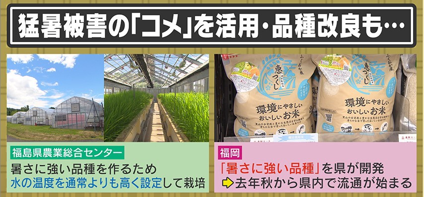 そんな中、福島県農業総合センターでは、暑さに強い品種を作るため水の温度を通常より高くして栽培しているとのことです。また、福岡県では、暑さに強い品種を県が開発し、2023年秋から県内で流通が始まりました。食味もコシヒカリと遜色ないということです。