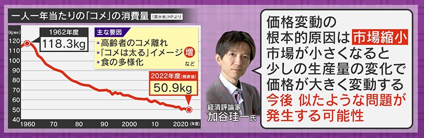 国民一人の一年あたりの「コメ」の消費量をみてみると、どんどん減っていて2022年は1962年と比べると半分以下になっています。加谷氏は、「価格変動の根本的原因は市場縮小。市場が小さくなると少しの生産量の変化で価格が大きく変動する。今後、似たような問題が発生する可能性がある」と話しています。