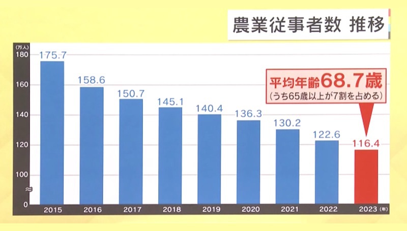 また、日本の農業従事者数も減っていて2015年と比べて60万人近く減少しています。その平均年齢も68.7歳と高齢化が進んでおり、65歳以上の人が約7割を占めるということです。