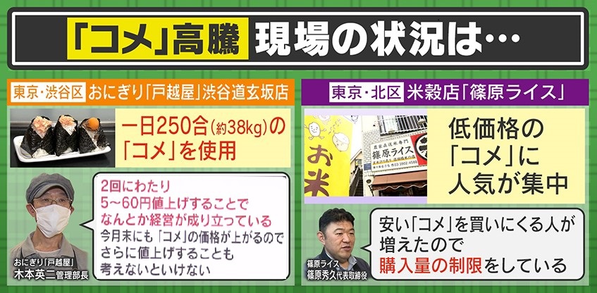 東京・渋谷区のおにぎり「戸越屋」渋谷道玄坂店は1日250合(約38kg)の「コメ」を使用するそうですが、「戸越屋」の木本英二管理部長は「2回にわたり50~60円値上げすることで何とか経営が成り立っている。今月末にも『コメ』の価格が上がるので、さらに値上げすることも考えないといけない」と話しています。また、東京・北区の米穀店「篠原ライス」は低価格の「コメ」に人気が集中しているそうで、「篠原ライス」の篠原秀久代表取締役は「安い『コメ』を買いに来る人が増えたので、購入量の制限をしている」ということです。