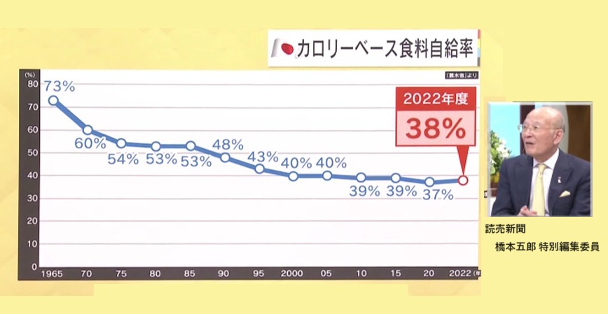 しかし、日本のカロリーベースの食料自給率を見てみると、2022年度で38%となっていて、「食の安全保障」を不安視する声もあります。読売新聞の橋本五郎特別編集委員は「軍事にはみんな敏感だが、食糧安保に関しては必ずしもそうではない。本当は一番大事な問題だと思う」と警鐘を鳴らしています。