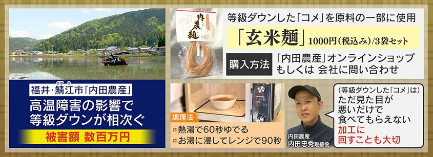 福井県鯖江市にある内田農産では、高温障害の影響で「コメ」の等級ダウンが相次ぎ、被害額は数百万円に上るということです。こうした「コメ」も見た目が悪いだけで味は変わらないということで、内田農産は等級ダウンした「コメ」を加工に回し、原料の一部に活用した麺「内農麺」を開発しました。味もおいしく、和洋中様々な味付けに合い好評だということです。