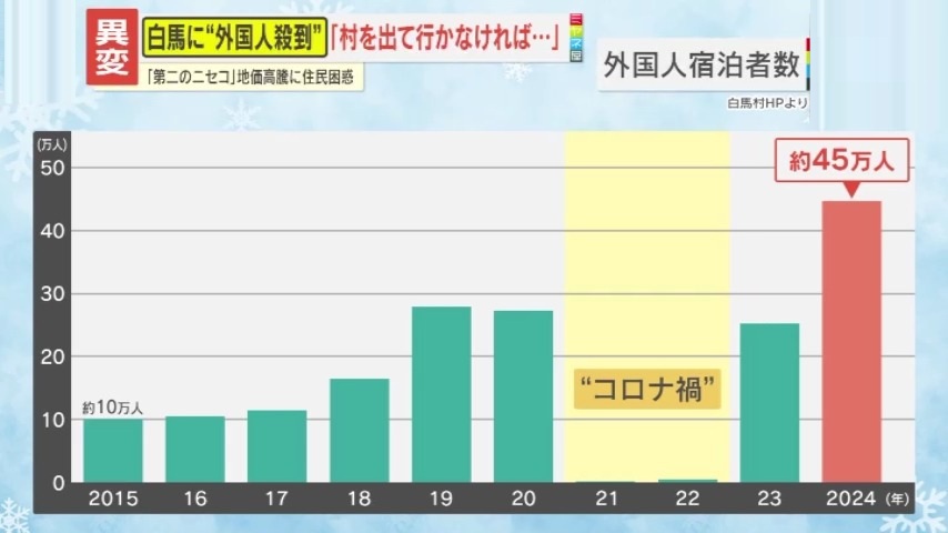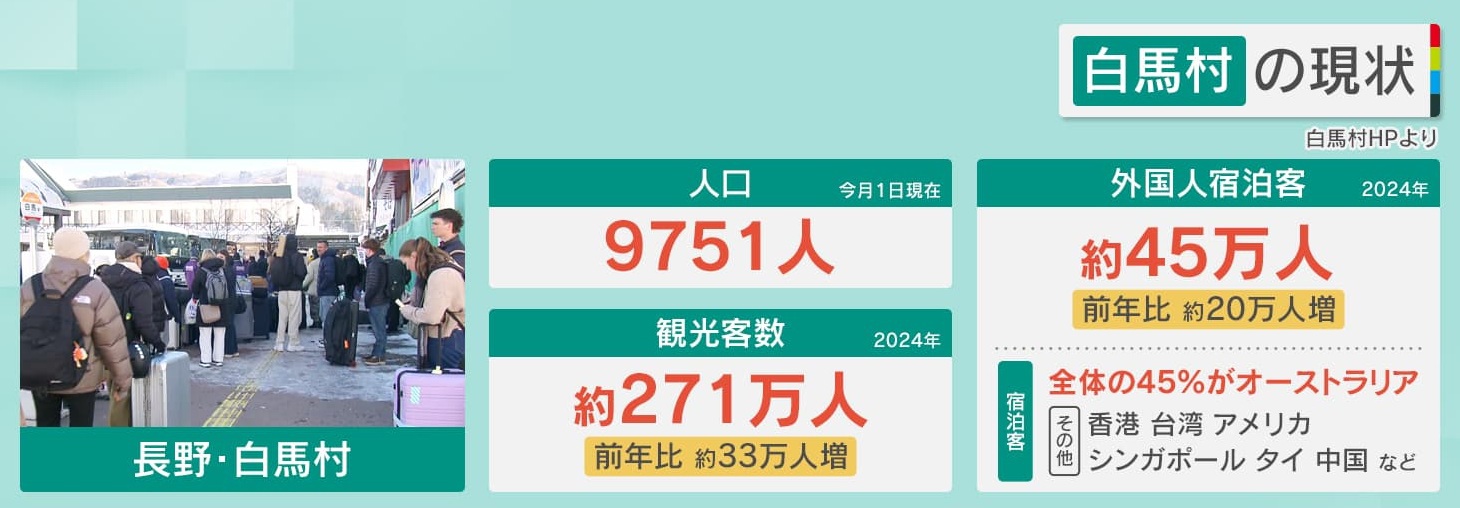 長野・白馬村は今、人口9751人(2026年1月1日現在)に対し観光客数=約271万人(2024年/前年比約33万人増)、外国人宿泊客=約45万人(2024年/前年比約20万人増)と、外国人が殺到しています。